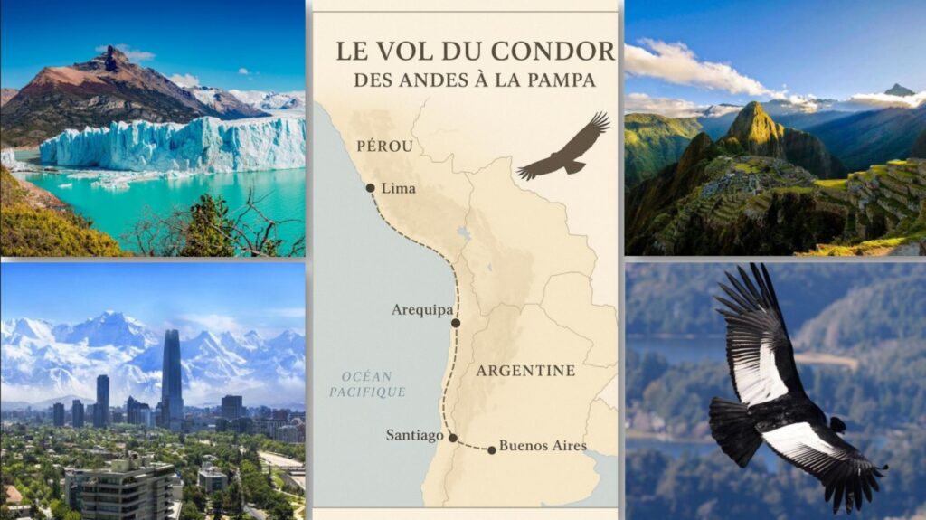 Du souffle sacré des Andes au battement envoûtant du tango argentin, sous le vol majestueux du condor, ce parcours vous entraîne du Pérou au Chili, jusqu’à l’Argentine, dans une odyssée à la fois géographique et intérieure.